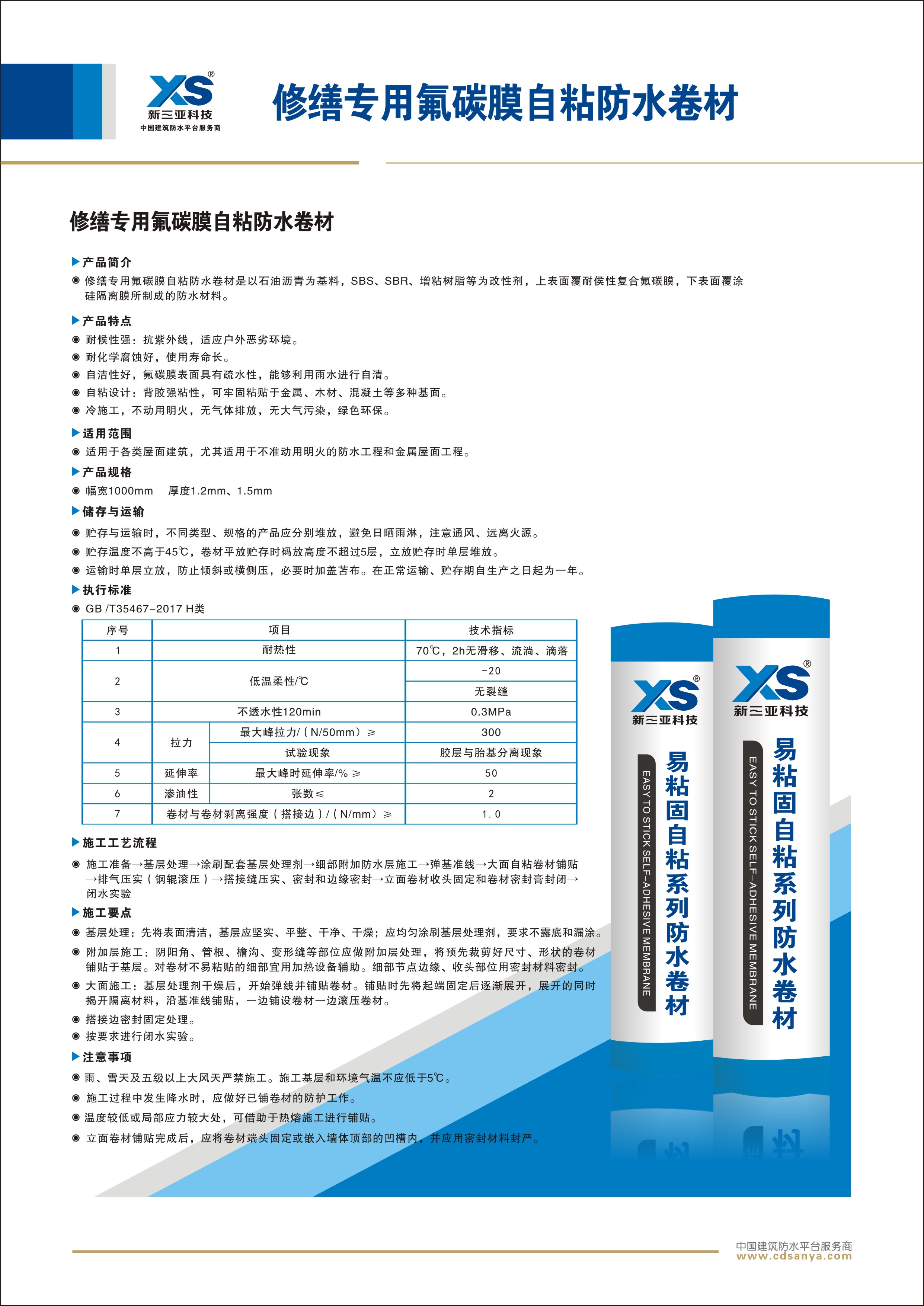 產(chǎn)品特點(diǎn) 1、氟碳膜耐紫外線,適應(yīng)戶(hù)外惡劣環(huán)境 2、氟碳膜耐化學(xué)腐蝕,使用壽命長(zhǎng) 3、氟碳膜自潔性好,不附著灰塵 4、自粘設(shè)計(jì),鋪貼方便 5、冷粘施工,不動(dòng)用明火,綠色環(huán)保 | ![]() | ![]() |