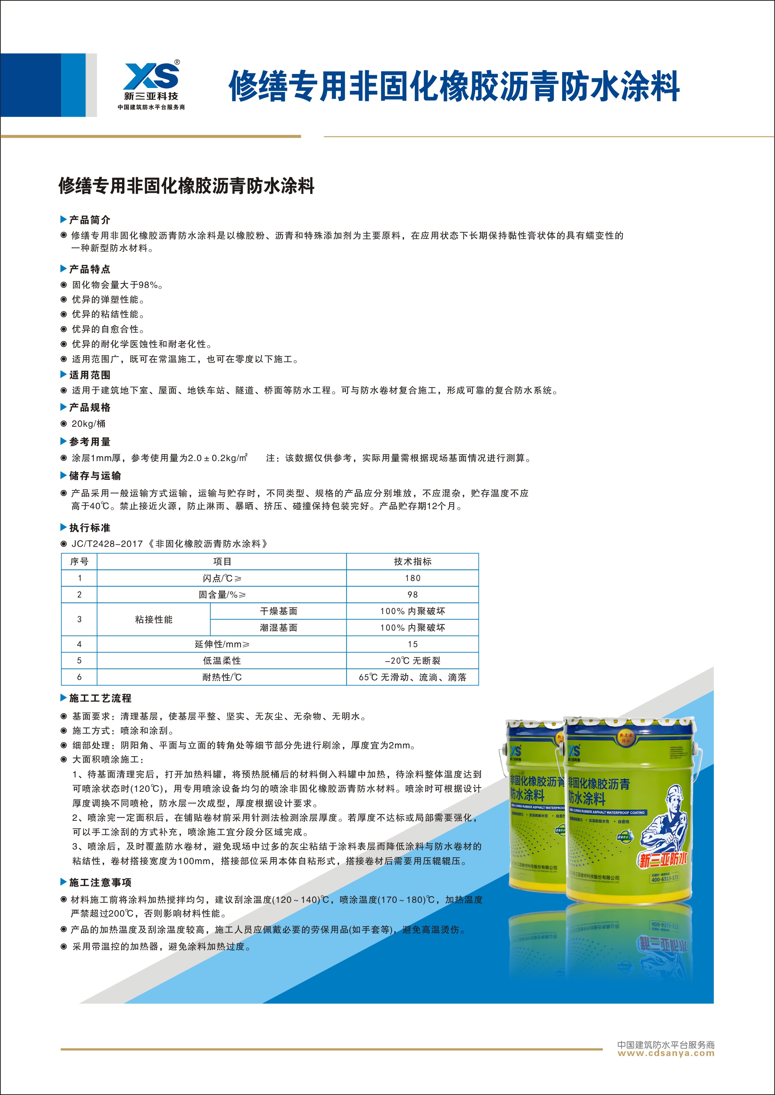 產(chǎn)品簡介: 修繕專用非固化橡膠瀝青防水涂料是以橡膠粉、瀝青和特殊添加劑為主要原料,在應(yīng)用狀態(tài)下長期保持黏性膏狀體的具有蠕變性的一種新型防水材料。 規(guī)格:20kg/桶 | ![]() |