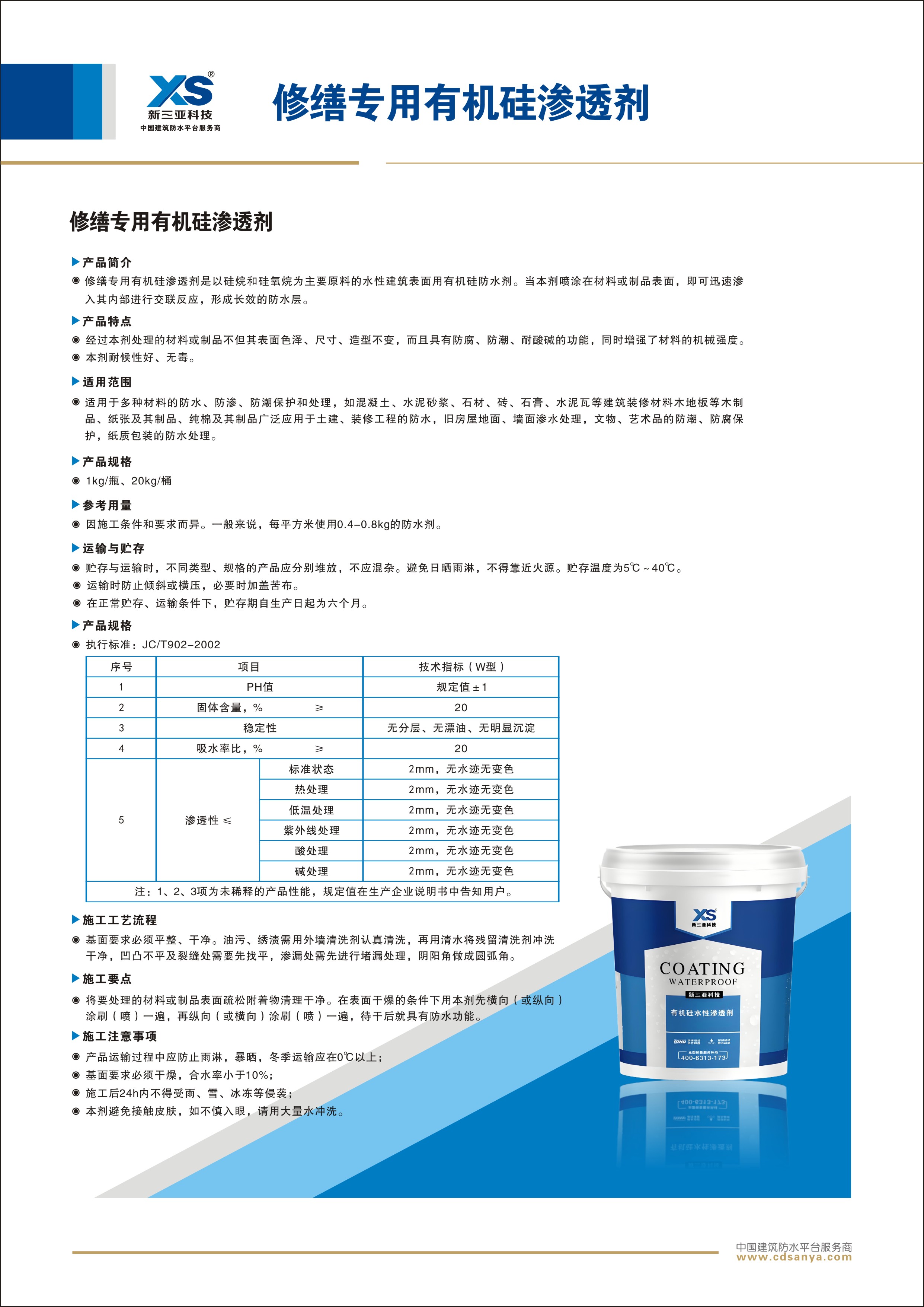 產品簡介: 修繕專用有機硅滲透劑是以硅烷和硅氧烷為主要原料的水性建筑表面用有機硅防水劑。當本劑噴涂在材料或制品表面,即可迅速滲入其內部進行交聯(lián)反應,形成長效的防水層。 規(guī)格:5kg/桶
